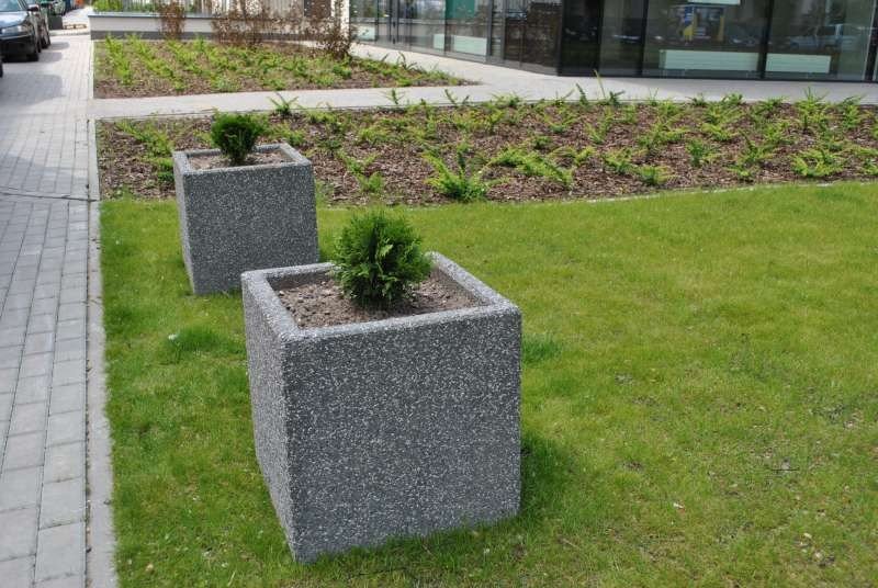 Donica widoczna na zdjęciu została wykonana w technologii betonu płukanego z fakturą zewnętrzną grysu amfibolit.